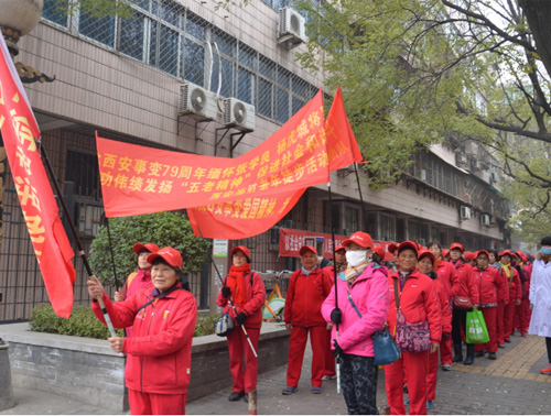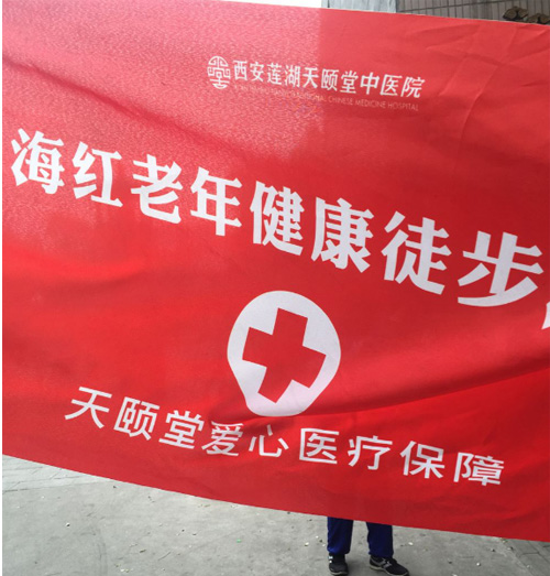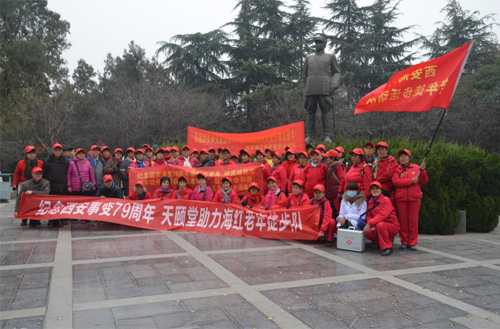 2015年12月11日至2015年12月12日,为期两天的“纪念西安事变79周年,海红老年徒步行走纪念先烈活动”顺利展开,200名年过花甲的老人身着统一的服装,头上佩戴着天颐堂中医院特别提供的红色帽子,徒步进行数十公里,从革命公园杨虎城纪念雕塑出发,沿途经过青年路止园杨虎城纪念馆,最终抵达莲湖公园。