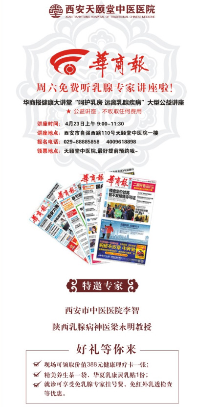 女王们!你的乳房常常被忽视吗?譬如内衣乱穿尺码,作息随便,饮食马虎,这会让乳房很受伤,严重会导致乳腺癌的到来。2016年4月23日(本周六)上午9:30,西安天颐堂中医医院携手《华商报》举办公益健康大讲堂,主讲人乳腺科学科代头人梁永明老师及西安市中医医院李智主任一起为您讲解乳腺疾病防治知识。