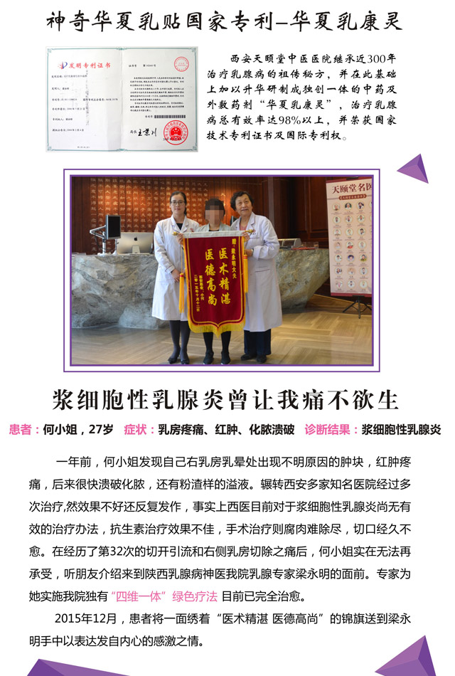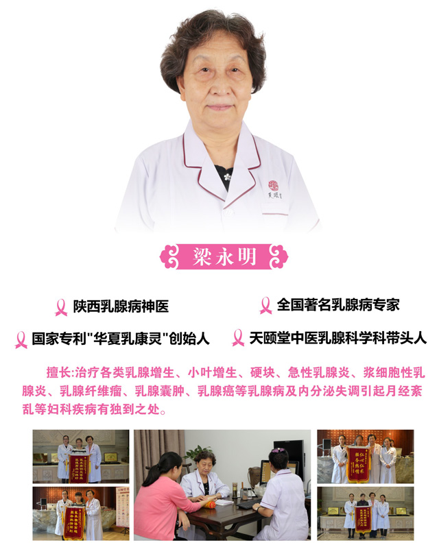 梁永明:全国著名乳腺病专家、中西医结合主任医师、国际专利“华夏乳康灵”创始人、天颐堂中医乳腺科学科带头人。擅长急性乳腺炎、浆细胞性乳腺炎、乳腺增生、乳腺纤维瘤、乳腺囊肿、乳腺癌、内分泌失调引起的各类妇科疾病的治疗。