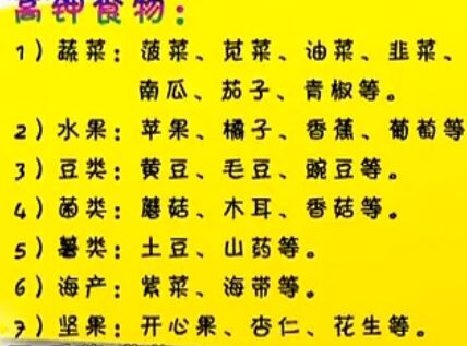 富含钾的食物进入人体可以对抗钠所引起的升压和血管损伤作用,可以在食谱中经常“露面”。这类食物包括豆类、冬菇、黑枣、杏仁、核桃、花生、土豆、竹笋、瘦肉、鱼、禽肉类,根茎类蔬菜如苋菜、油菜及大葱等,水果如香蕉、枣、桃、橘子等。